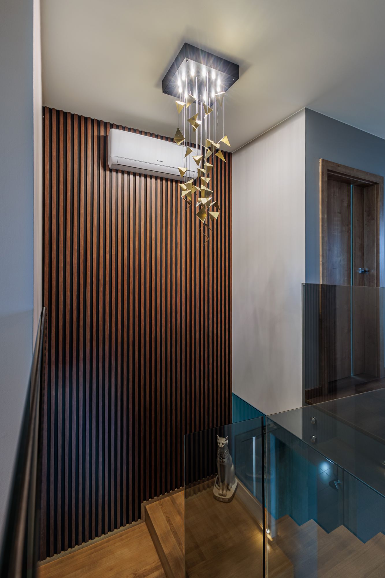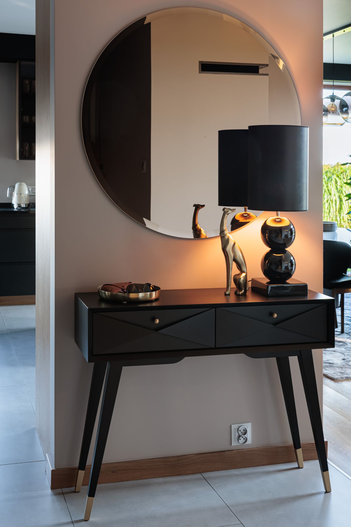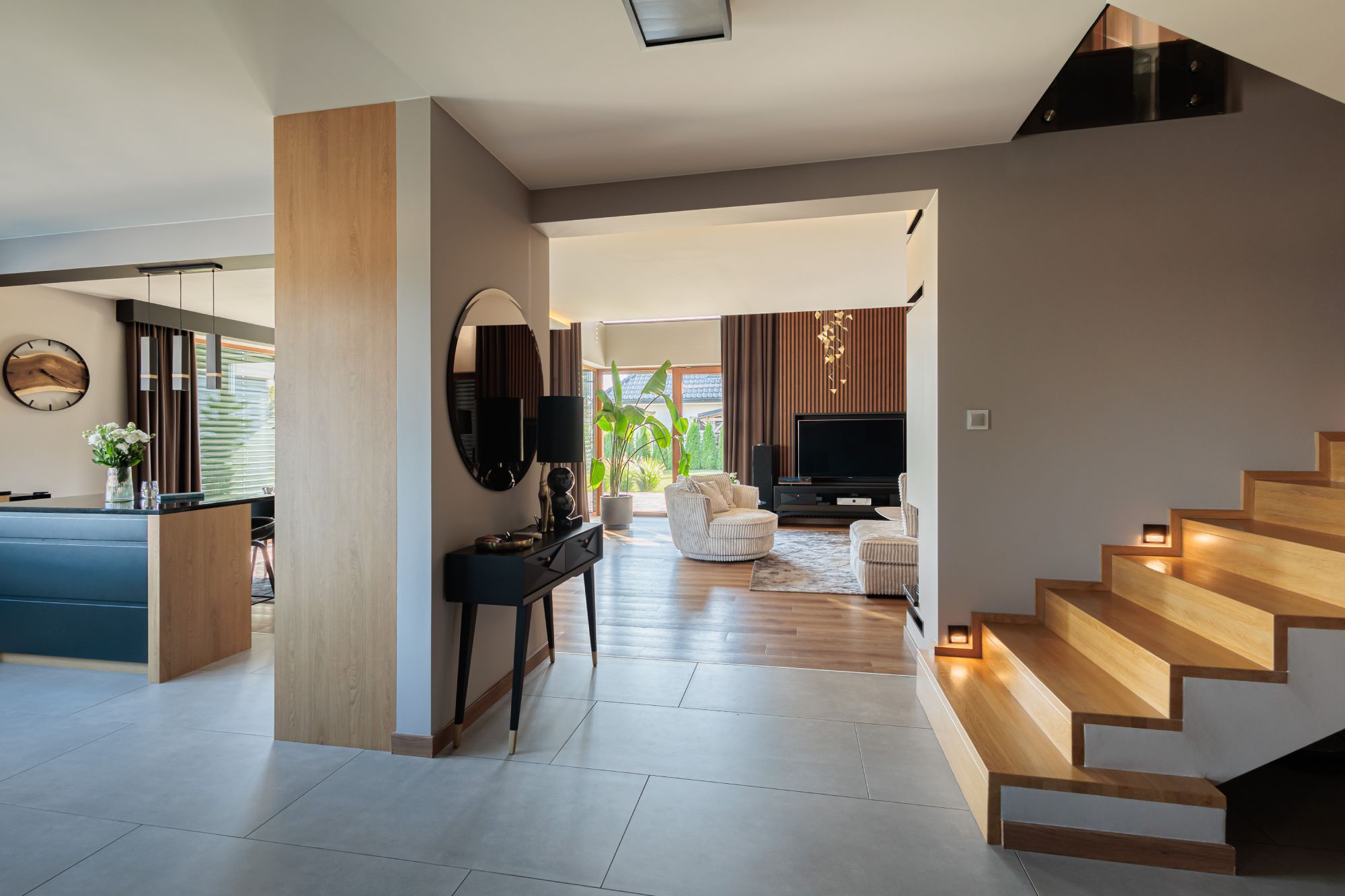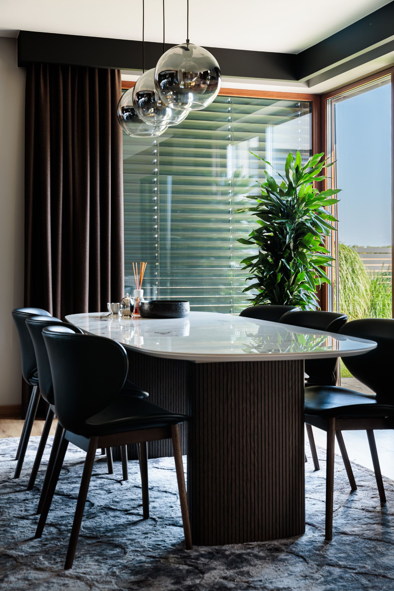 Ten nowoczesny dom pod Warszawą wymagał metamorfozy, aby jego wnętrze było spójne z bryłą budynku i – co najważniejsze – odpowiadało stylowi życia właścicieli. Mieszka tu para z dzieckiem i małym psem, a ich codzienność to intensywna praca, rodzinny czas oraz spotkania towarzyskie. Dlatego dom miał stać się przestrzenią, która zapewni im odpoczynek, a jednocześnie pozwoli cieszyć się wspólnymi chwilami w gronie bliskich.