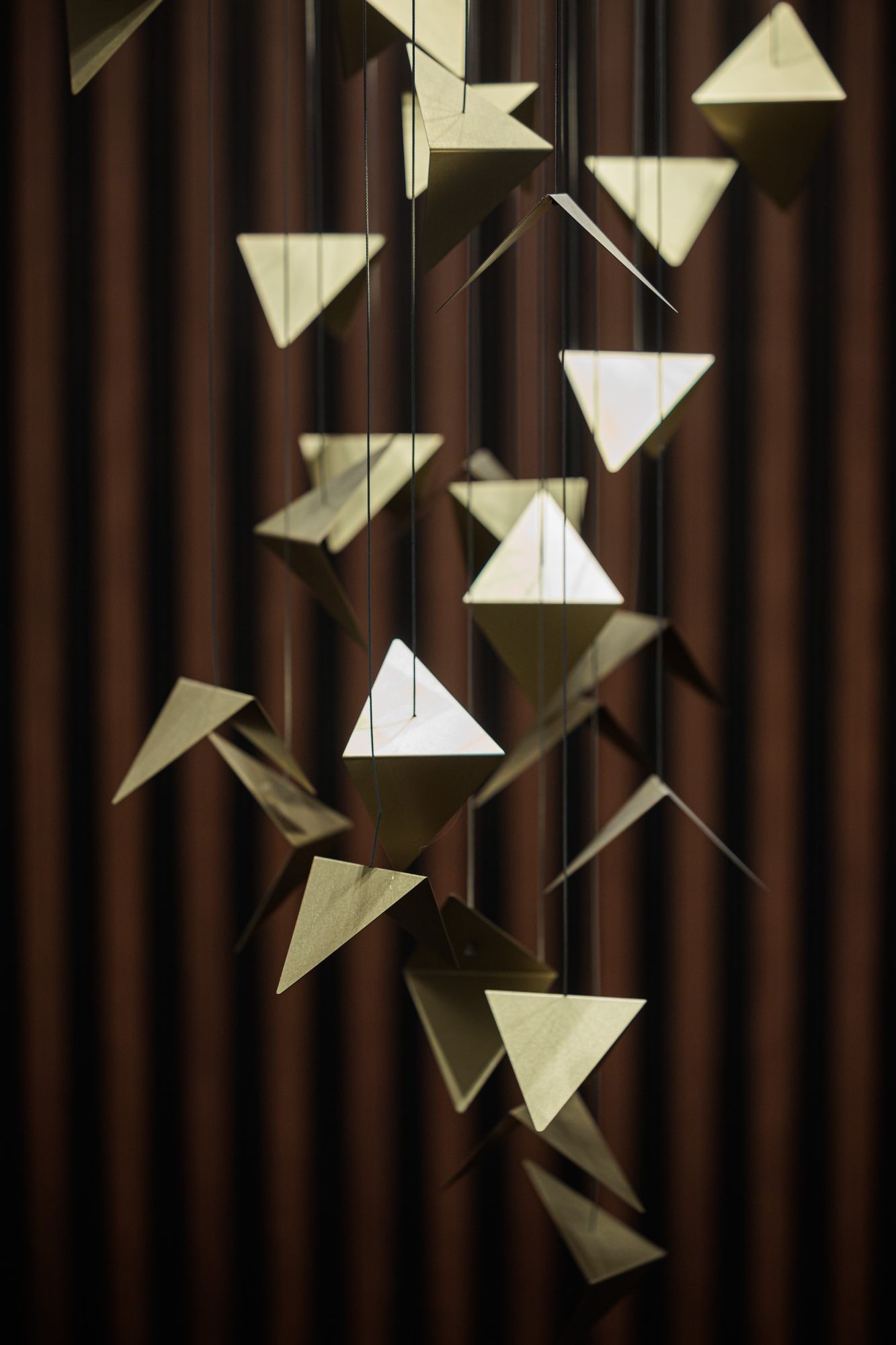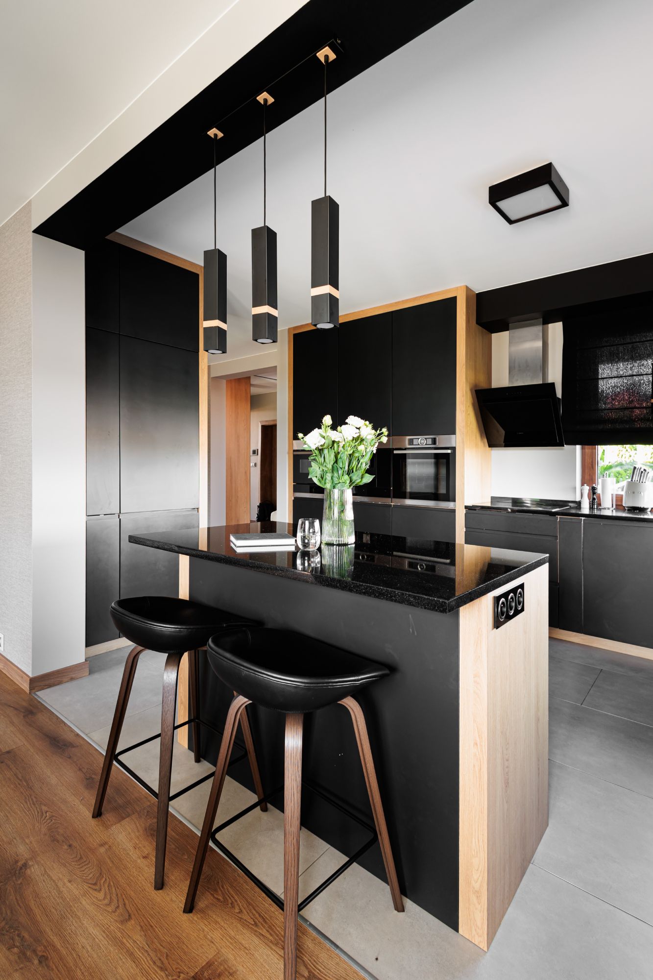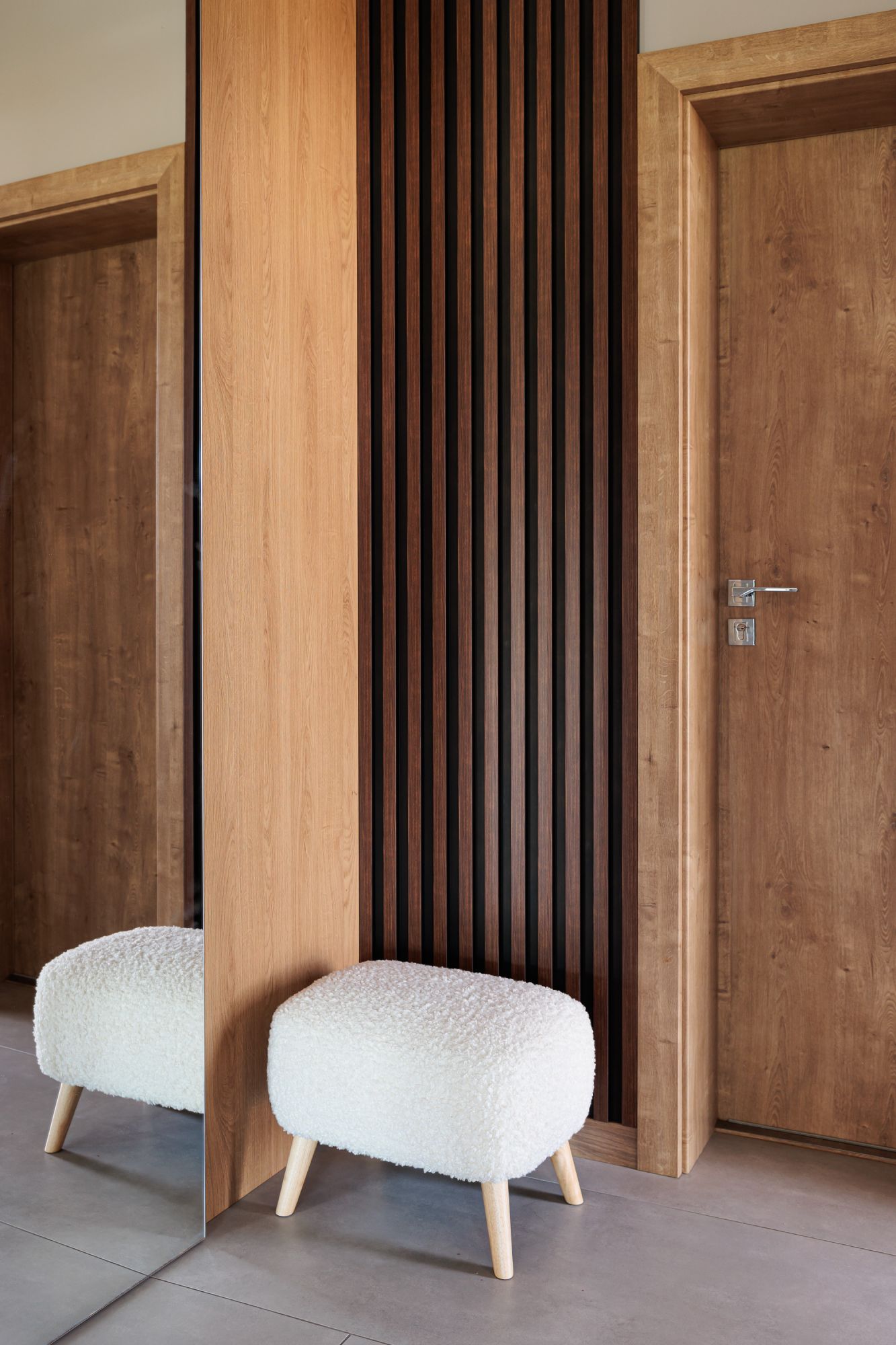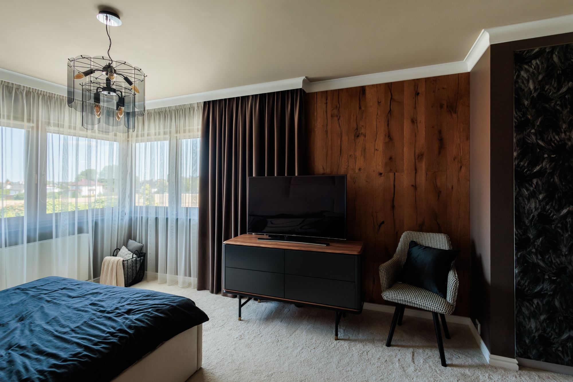 Projekt obejmował część dzienną w układzie otwartym – przedpokój, kuchnię, jadalnię i salon – a także główną sypialnię z łazienką. Założenia były jasne: wnętrze miało być przytulne, otulające, z przewagą ciemniejszych barw, które nadadzą mu elegancji i nastroju, ale bez efektu przytłoczenia. Ważnym elementem stało się drewno i lamele, tkaniny oraz tapety o fakturze przypominającej materiał. W kuchni pojawiły się ciemne, grafitowe fronty, a w jadalni wygodny stół z miejscem dla sześciu osób – tak, by całość była zarówno funkcjonalna, jak i komfortowa na co dzień.