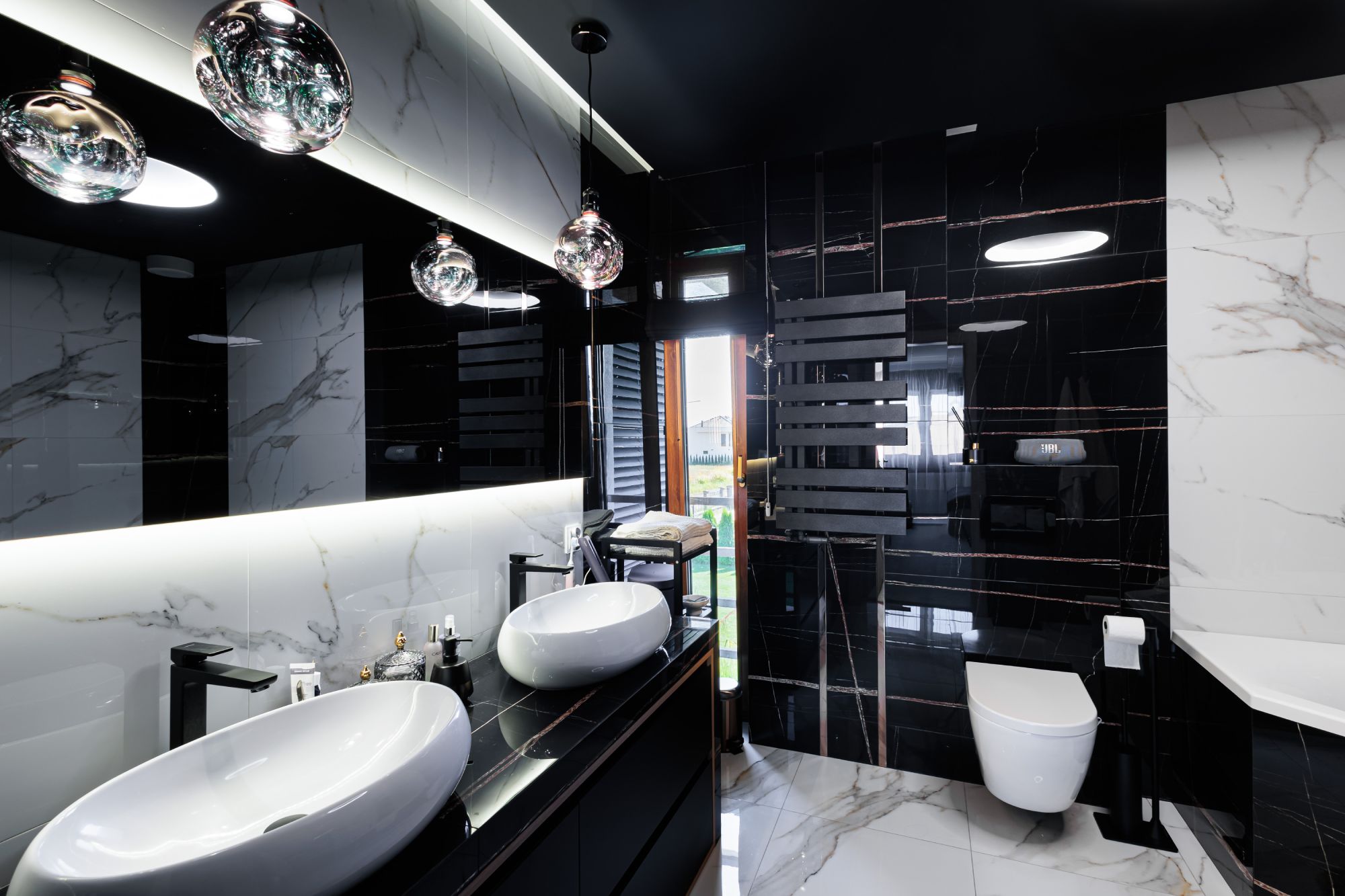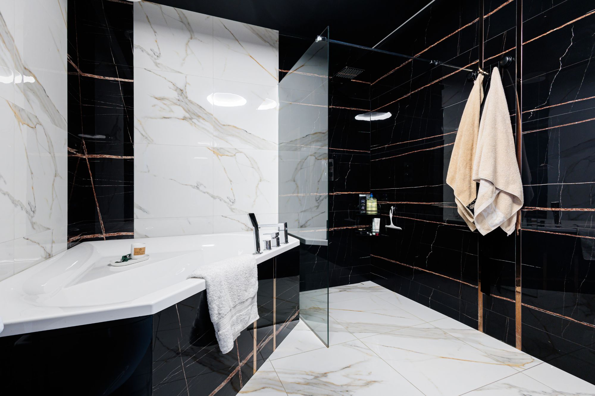 Łazienka przynależna do sypialni zachowała istniejący układ i wykończenie, ale dzięki dobranym dodatkom i zmianom w detalach zyskała nowy charakter. Stworzyliśmy w niej atmosferę domowego SPA – wnętrze jest nastrojowe, eleganckie i komfortowe zarówno do szybkiego porannego prysznica, jak i do długiej kąpieli w spokojnym rytmie wieczoru.