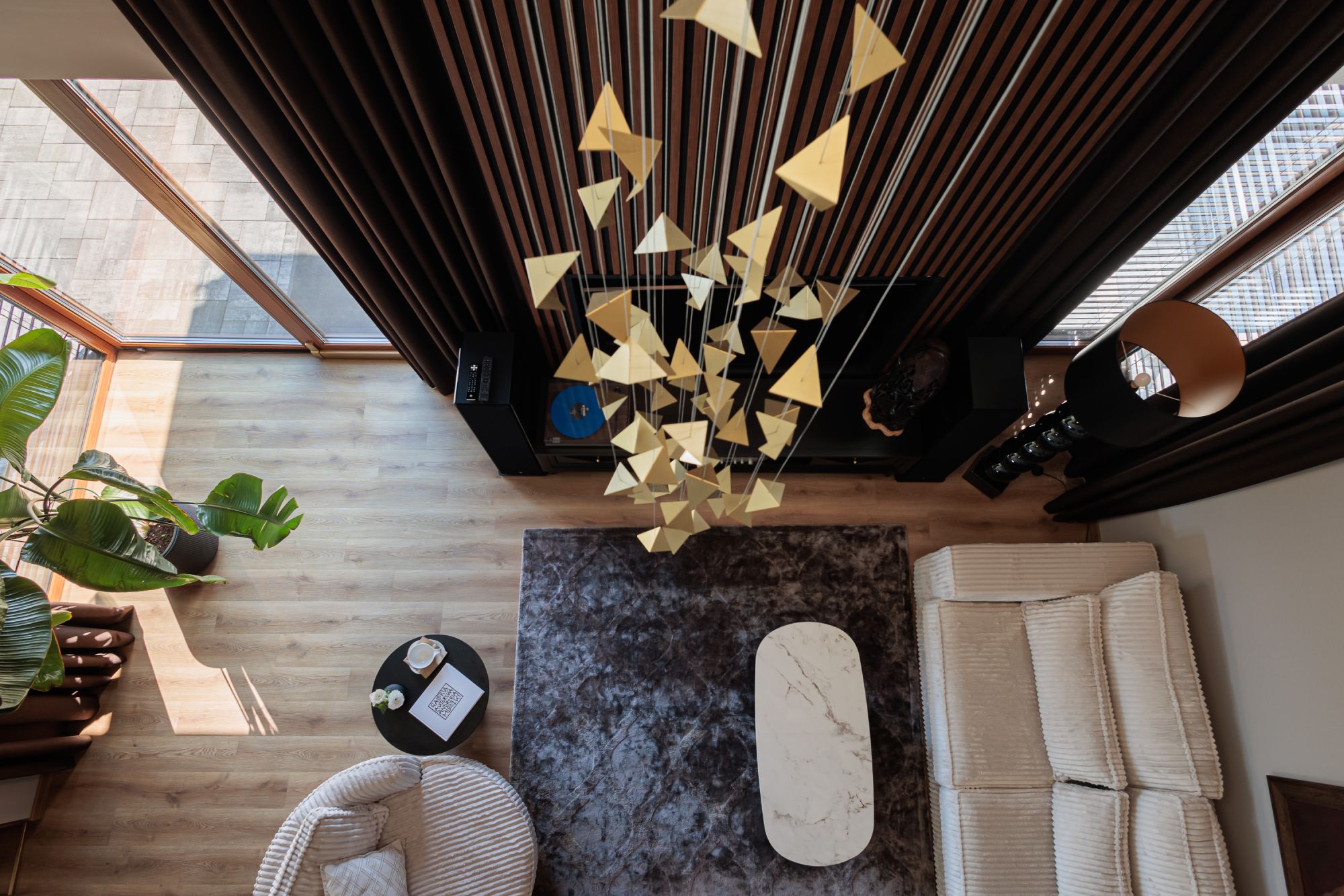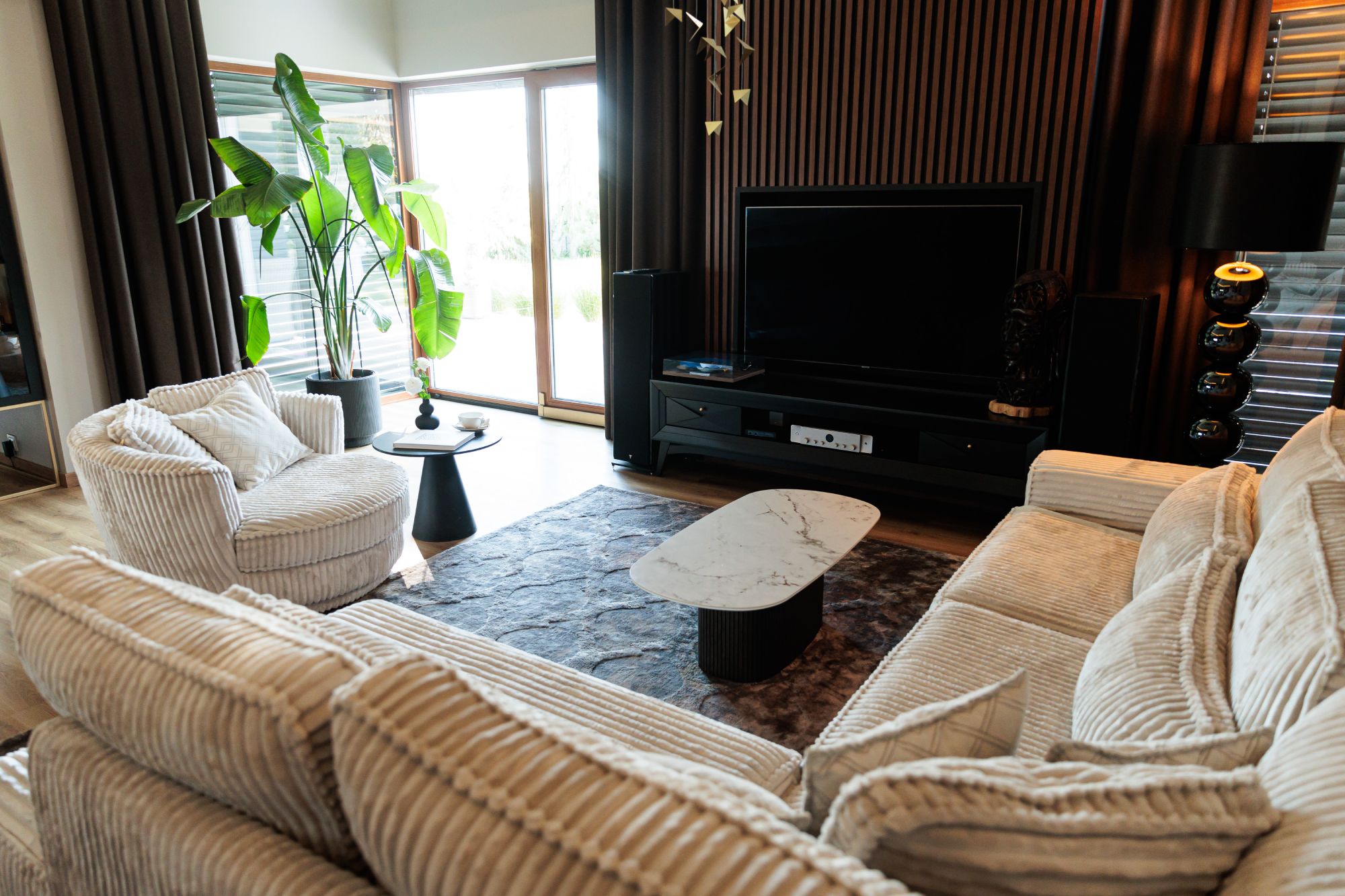 W salonie głównym punktem aranżacji stał się jasny narożnik – wybrany i zakupiony wspólnie z inwestorami na początku projektu. To wokół niego powstała dalsza koncepcja wystroju. Duża, nowoczesna sofa  w połączeniu z odpowiednio zaplanowanym oświetleniem i dekoracjami tworzy centrum życia rodzinnego. Zadbano o każdy detal, tak aby przestrzeń prezentowała się równie dobrze w perspektywie dziennej, jak i wieczornej, a także widziana z antresoli.