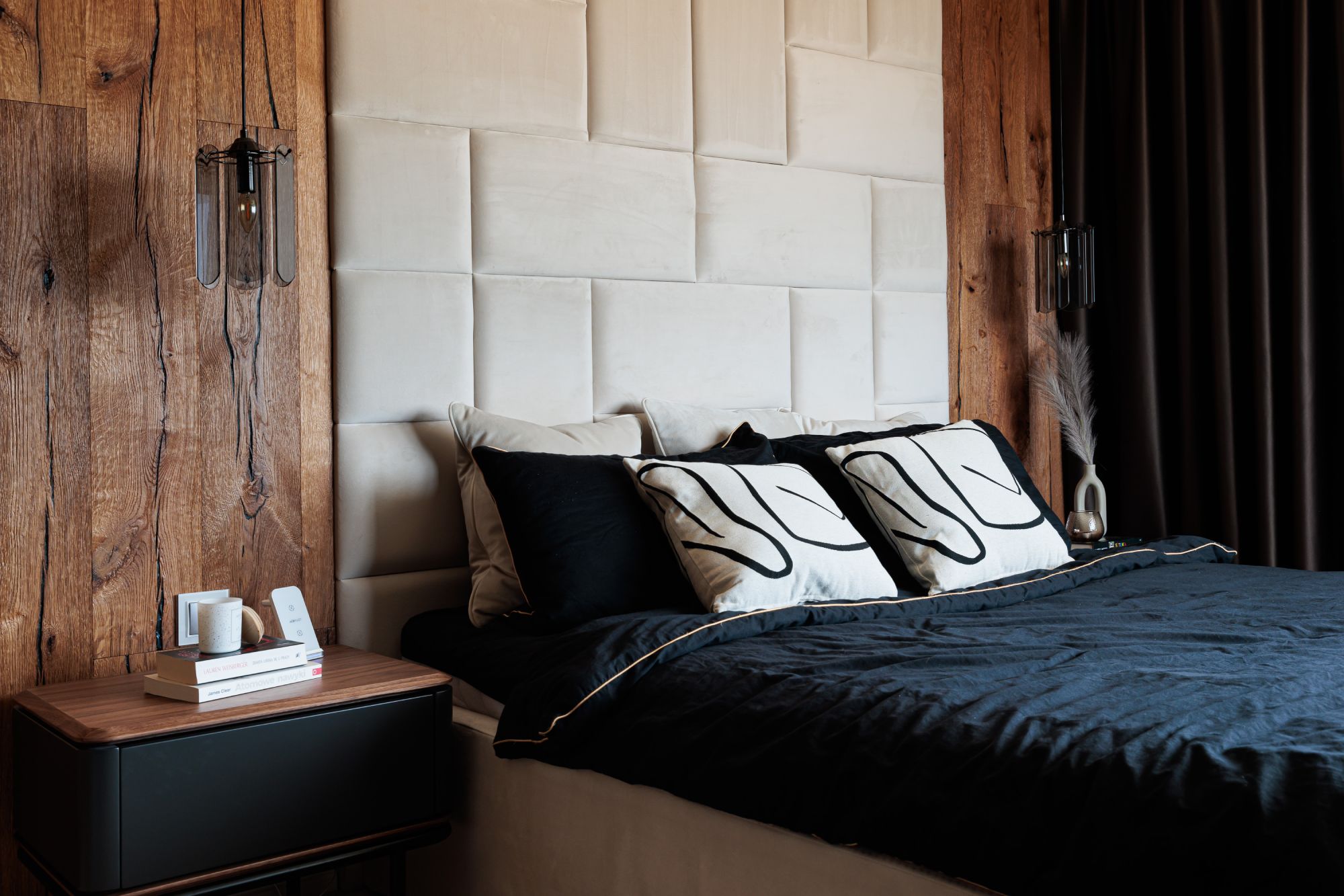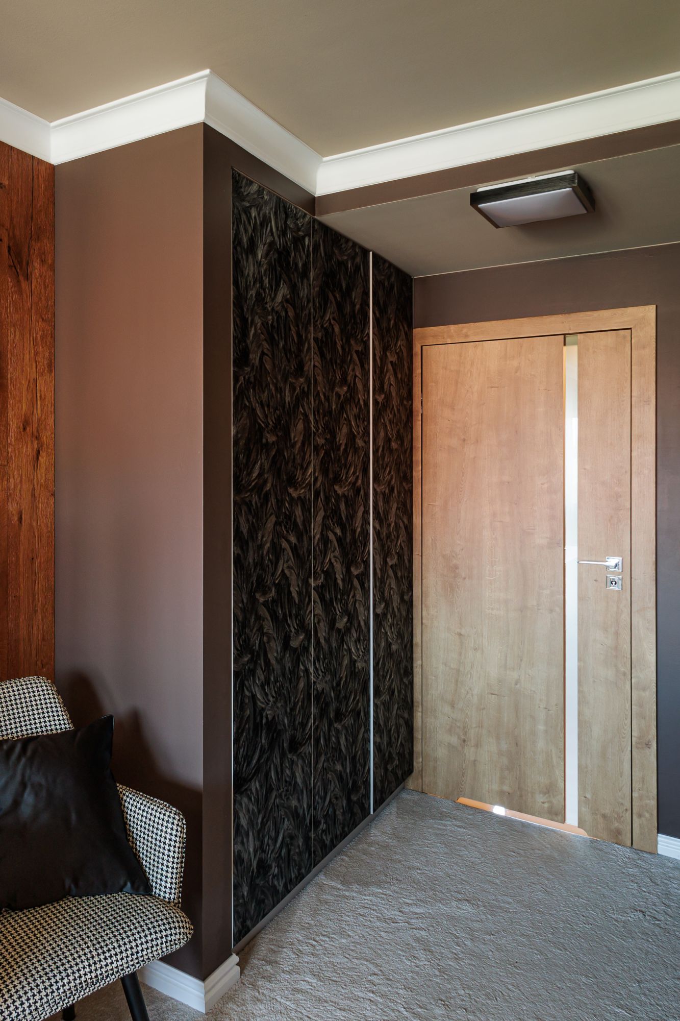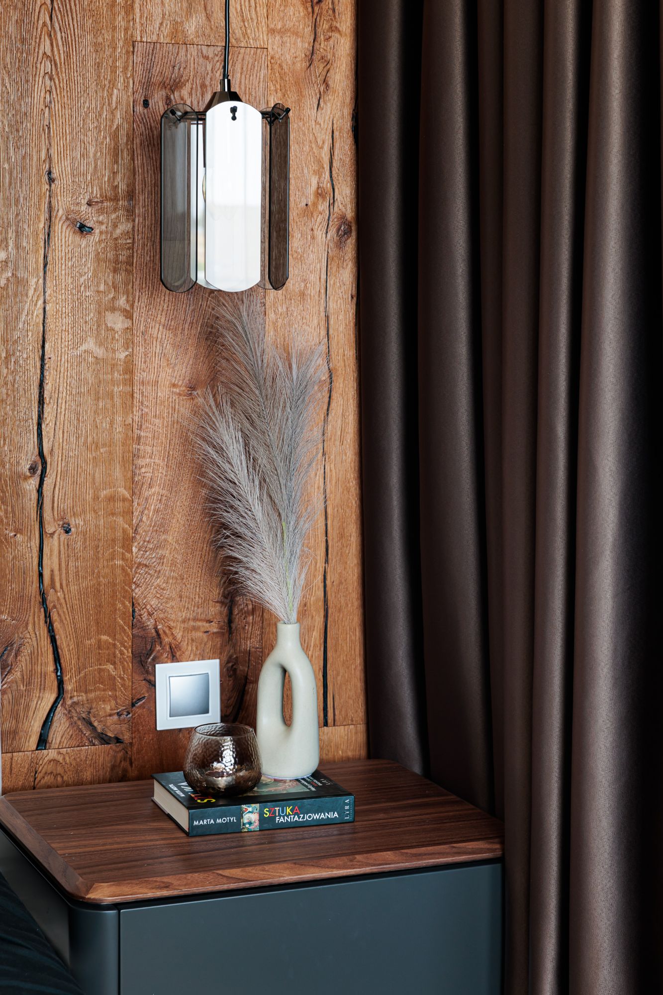 W sypialni postawiono na atmosferę spokoju i relaksu. Ciemniejsze, brązowe ściany, beżowy sufit oraz tapeta w stylu tekstylnym, zastosowana na szafie, wprowadzają otulający klimat. Tapicerowany zagłówek, który wcześniej ginął na tle jasnych ścian, teraz stał się mocnym akcentem wnętrza. Całość uzupełniają miękkie tkaniny i naturalne materiały, które sprzyjają odpoczynkowi, wyciszeniu i dobremu snu.